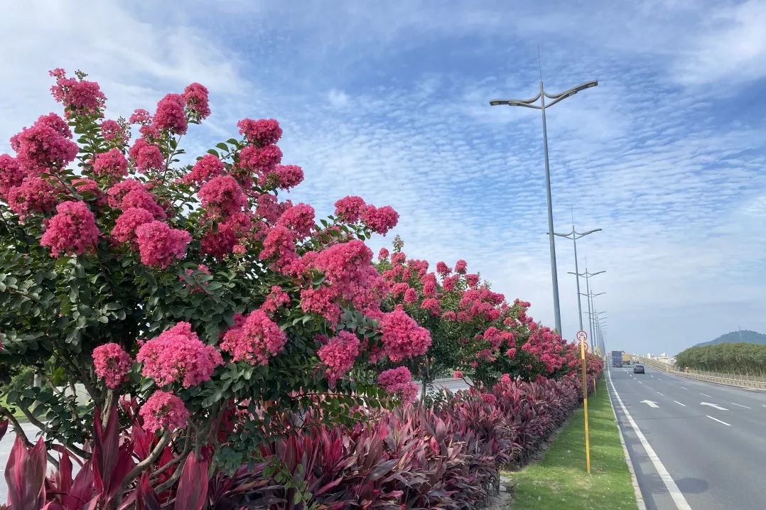 华体会(中国)集团下属粤华园林公司作为珠海大道的专业养护单位,精心种植了小叶紫薇、大叶紫薇与蟛蜞菊成为城市道路景观的点睛之笔,为市民和游客献上了一场夏日花廊的视觉盛宴。